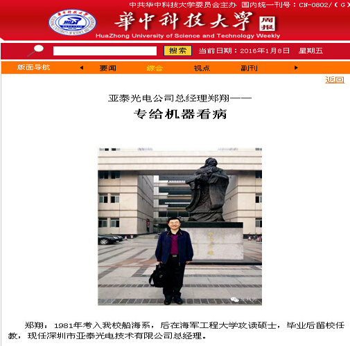 鄭翔:1981年考入華中科技大船海系,后在海軍工程大學(xué)攻讀碩士,畢業(yè)后留校任教,現(xiàn)任深圳市亞泰光電技術(shù)有限公司總經(jīng)理。