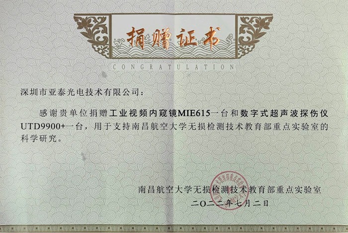 7月1日,深圳市亞泰光電技術(shù)有限公司(以下簡(jiǎn)稱“亞泰光電”)向南昌航空大學(xué)無(wú)損檢測(cè)技術(shù)教育部重點(diǎn)實(shí)驗(yàn)室(以下簡(jiǎn)稱“實(shí)驗(yàn)室”)捐贈(zèng)兩臺(tái)無(wú)損檢測(cè)設(shè)備,用于支持實(shí)驗(yàn)室無(wú)損檢測(cè)科學(xué)研究。亞泰光電公司鄭翔總經(jīng)理和實(shí)驗(yàn)室李志農(nóng)教授通過(guò)云端方式出席捐贈(zèng)儀式。